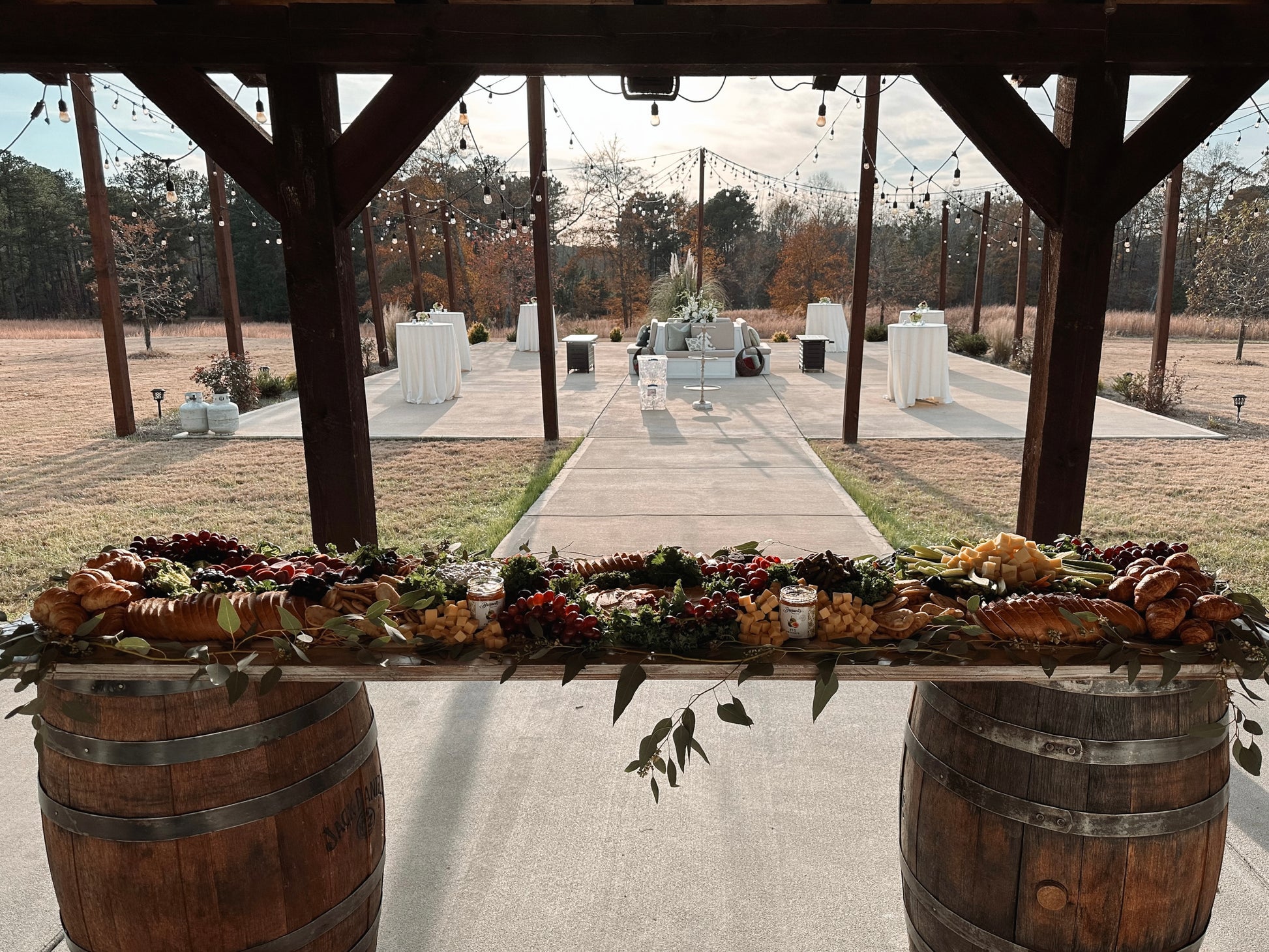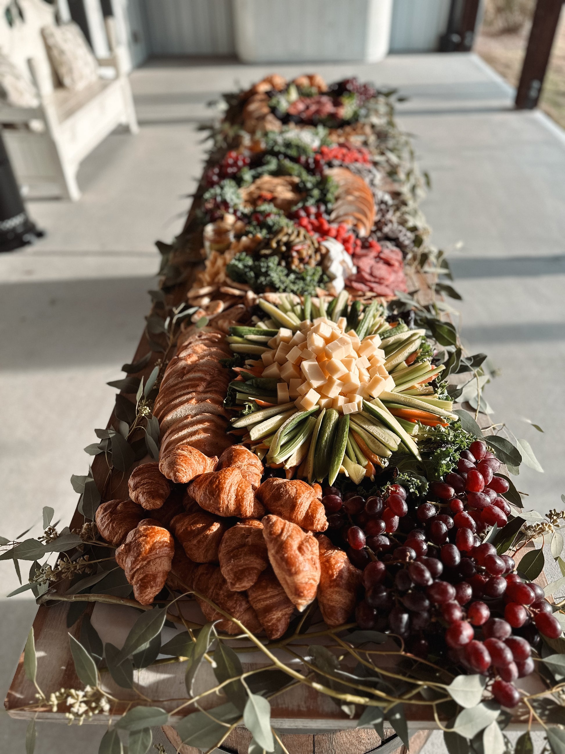 Includes hummus, spinach artichoke dip, pita chips, Naan, Italian bread, crackers, crudités, salami, cheese, preserves, pickled cornichorn/okra, mixed nuts, grapes, seasonal fruits, and disposable serving utensils. Complimentary seasonal greeneries to enhance your table.